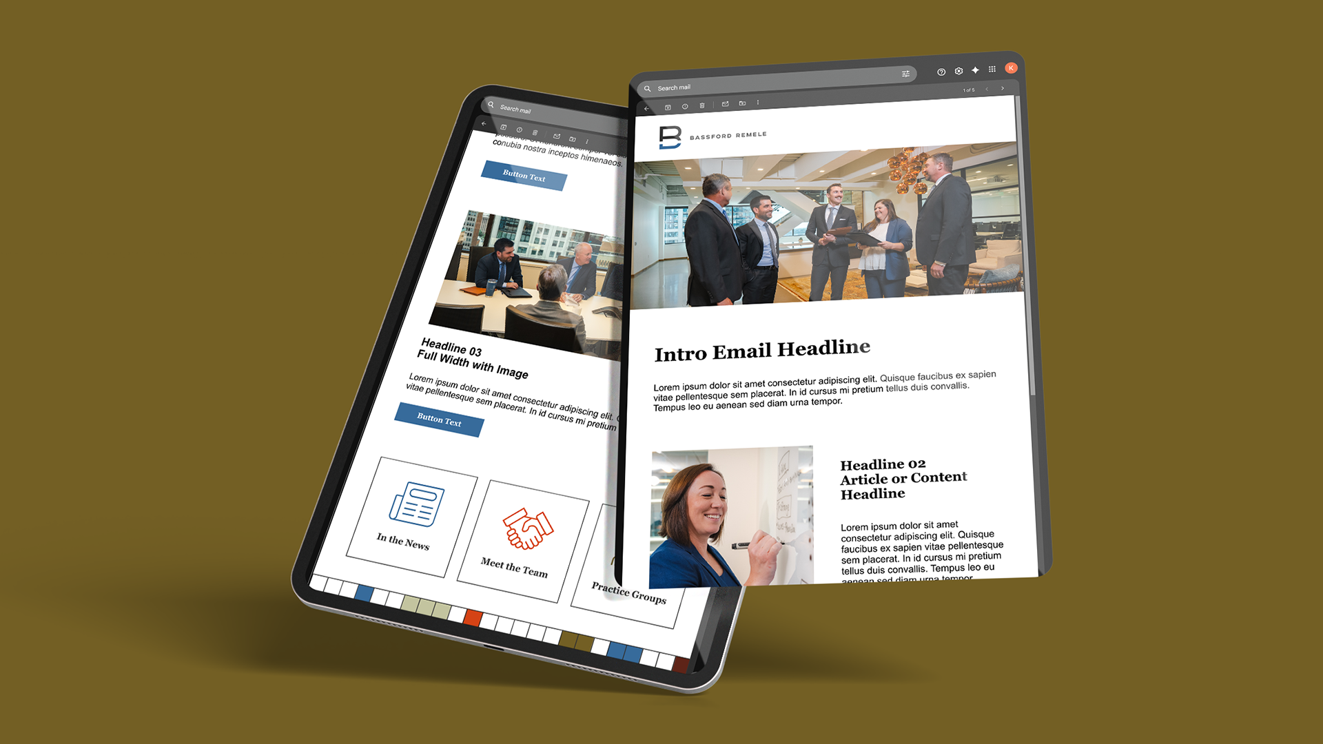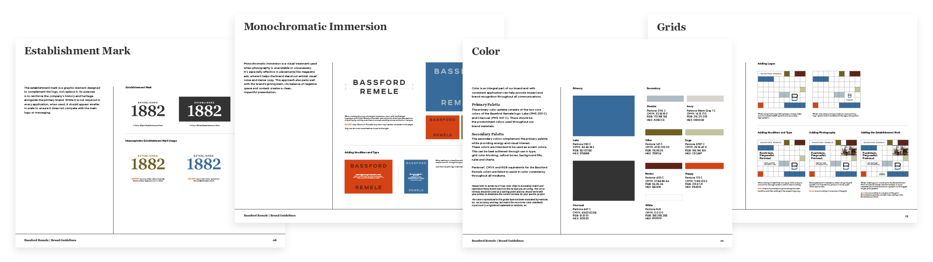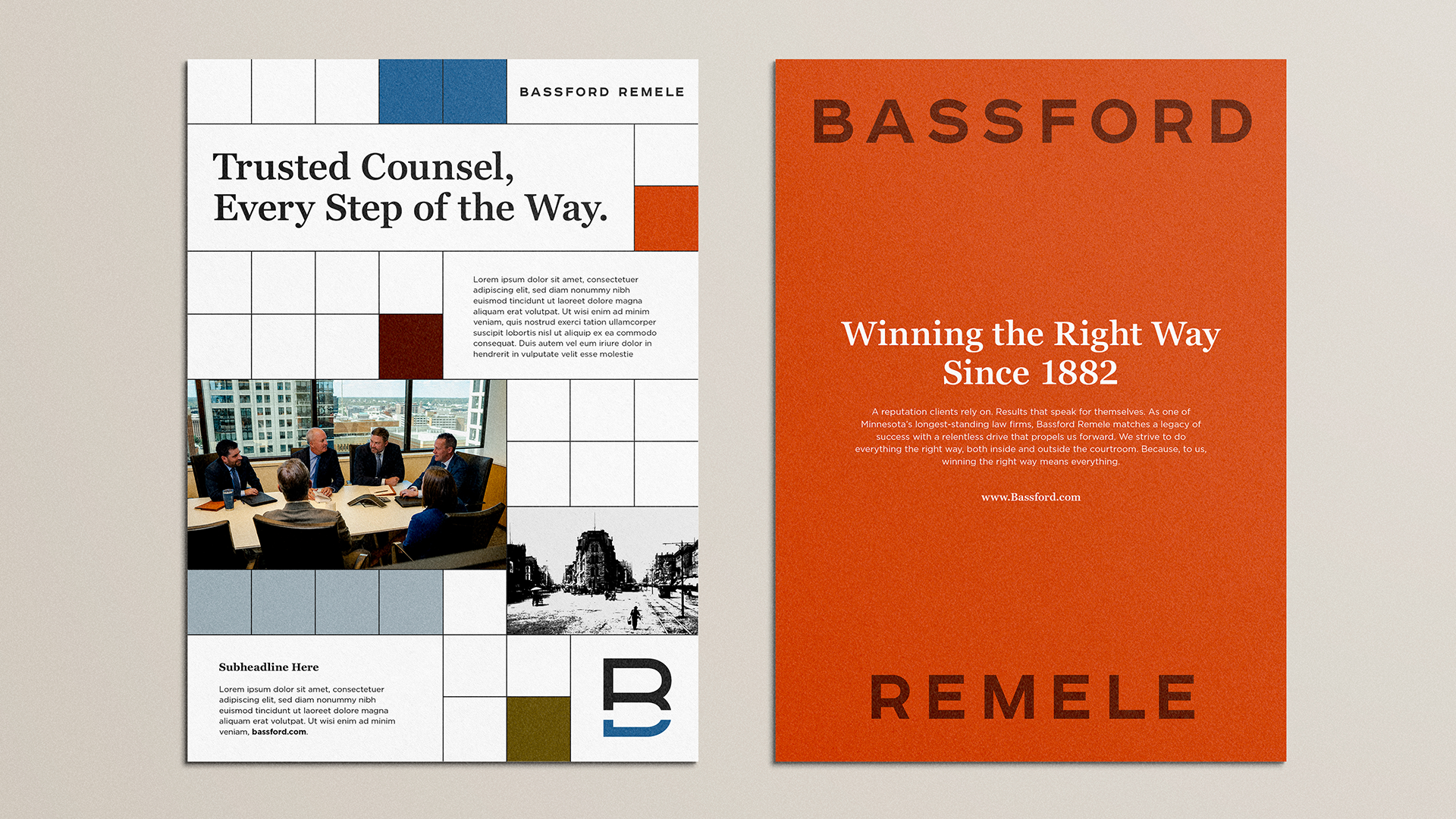 The resulting brand system translates that strategy into a modern, flexible visual language. A refined logo system, expanded color palette, and structured grid bring clarity and order, while warm photography, thoughtful color blocking, and subtle pattern use add personality and energy. Design choices intentionally balance tradition and innovation, using strong typography, negative space, and modular layouts to create consistency across digital, print, and environmental applications. Together, the refresh delivers a cohesive brand that feels confident but not rigid, professional yet personal, positioning Bassford Remele as powerful advocates with a clear point of view and a reputation clients can rely on.