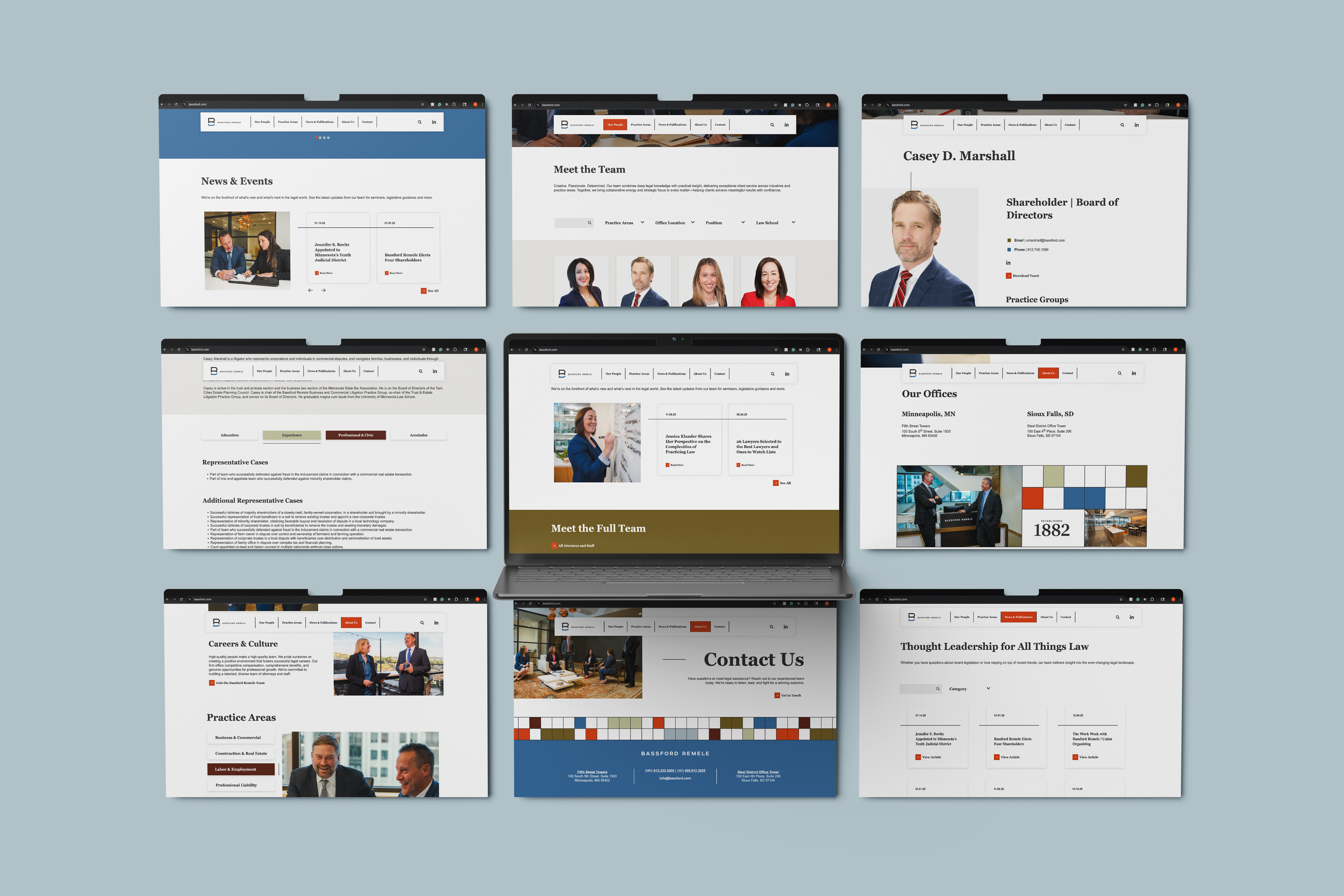Our approach elevated attorney bios and practice areas as primary entry points, simplified content hierarchy, and introduced a centralized thought leadership hub. The design of bassford.com balances structure and warmth through refined grids, generous white space, authentic photography, and accessible UX, creating a modern, credible experience that reflects Bassford Remele’s professionalism, experience, and national reach.