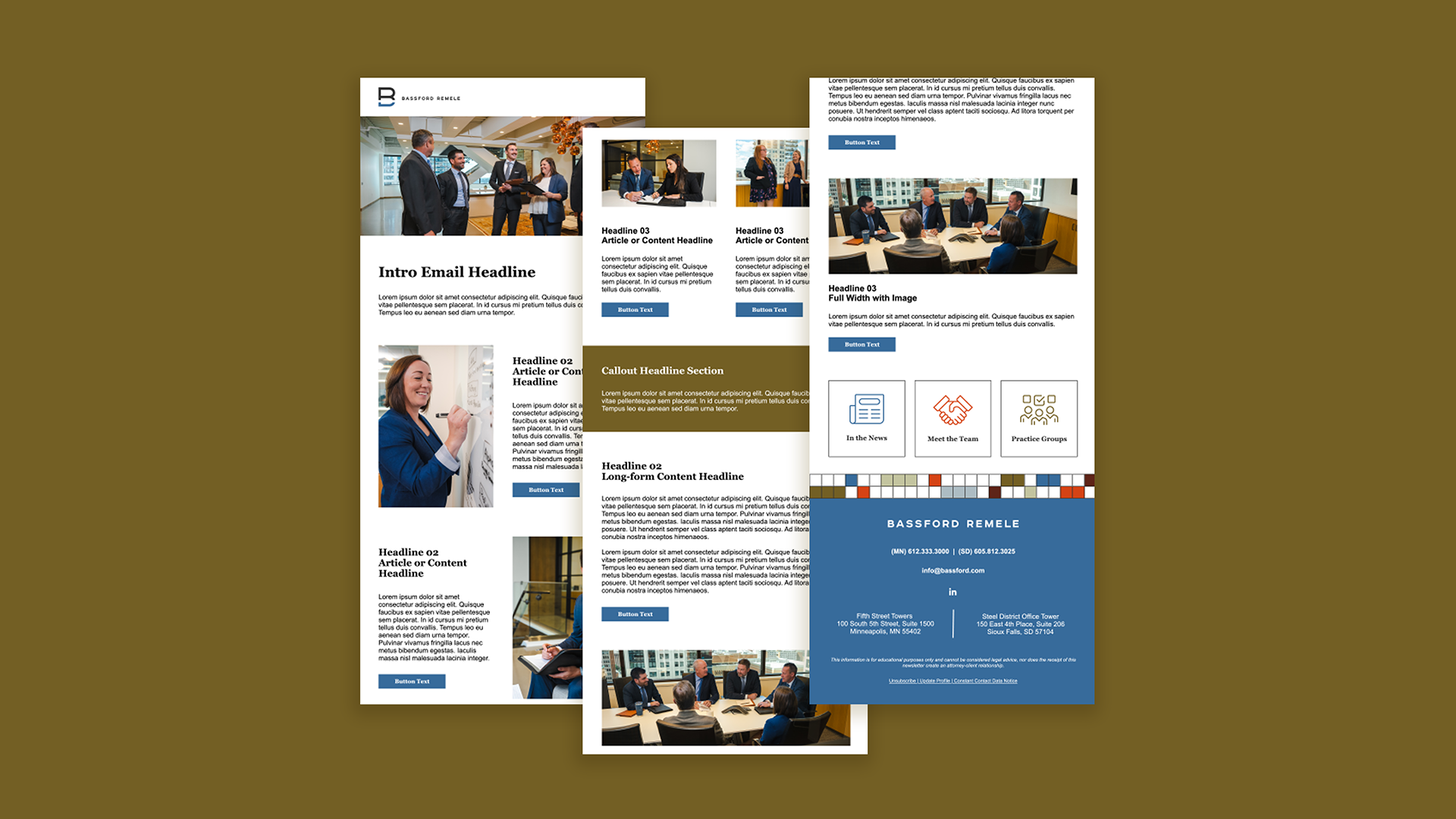 The Bassford Remele brand voice is poised, confident, and quietly powerful, balancing a legacy of trust with forward-looking energy while remaining approachable, authentic, and human. Its overall feel is refined but not stiff, passionate without being loud, and grounded in clarity rather than legal jargon, speaking in language real people understand. The tone reflects a firm that is tried and trusted yet insightful and innovative, combining measured confidence with warmth, collaboration, and purpose. The overarching goal of the brand is to convey that Bassford Remele wins the right way by being powerful advocates who build personal connections, guide clients with clarity and integrity, and turn complex legal challenges into shared success through expertise, teamwork, and unwavering professionalism. For additional context and detail, see the full Bassford Remele Brand Guidelines.