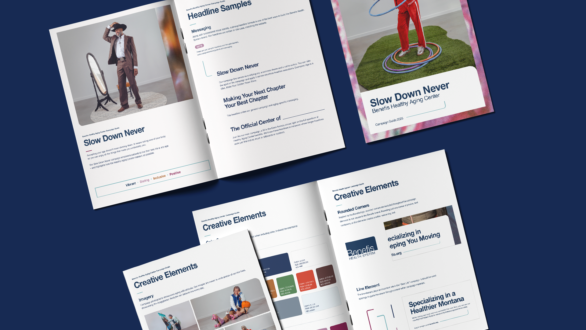 The Slow Down Never campaign was developed to introduce the Benefis Healthy Aging Center, a new facility designed to help active Montanans age well by making it easier to manage their evolving healthcare needs in one convenient location. Many adults 60+ don’t identify as “seniors,” so our strategy focused on reframing aging as a continuation of an active, fulfilling lifestyle supported by proactive care. The campaign aimed to build community awareness, inspire excitement around the center’s launch, support fundraising efforts, and expand on Benefis’ “Making Your Best Life Possible” platform. Visually, we highlighted vibrant, personality-filled portraits of older adults engaged with props that reflect their passions, reinforcing the message that staying healthy empowers them to keep doing what they love.