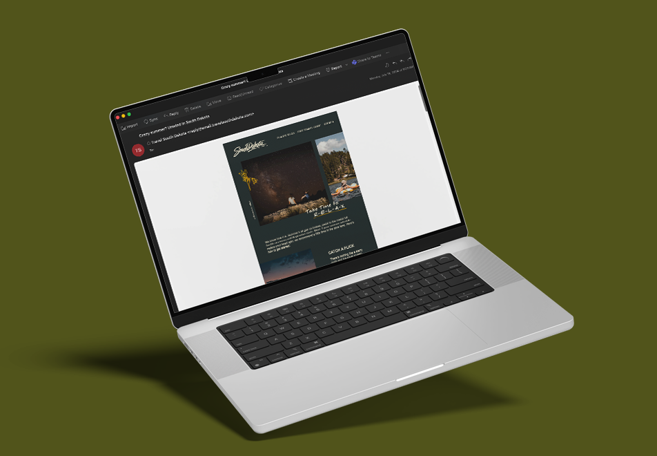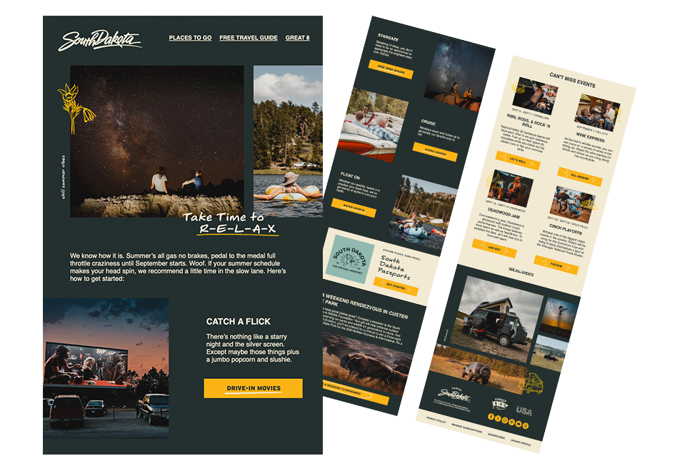 The Travel South Dakota email experience was reimagined through a dynamic, visually driven template designed to adapt to each traveler’s journey. The refreshed layout aligns seamlessly with broader campaign creative, using eye-catching design, clear hierarchy, and tailored visuals to deliver the right inspiration to both first-time and repeat visitors. Creative updates extended into refreshed triggered emails and seasonal variations, ensuring every touchpoint feels timely and intentional. By pairing thoughtful design with behavior-based personalization and curated travel suggestions, the email journeys feel cohesive, meaningful, and creatively engaging, reaching even inactive users with re-engagement messages that rekindle their sense of exploration.